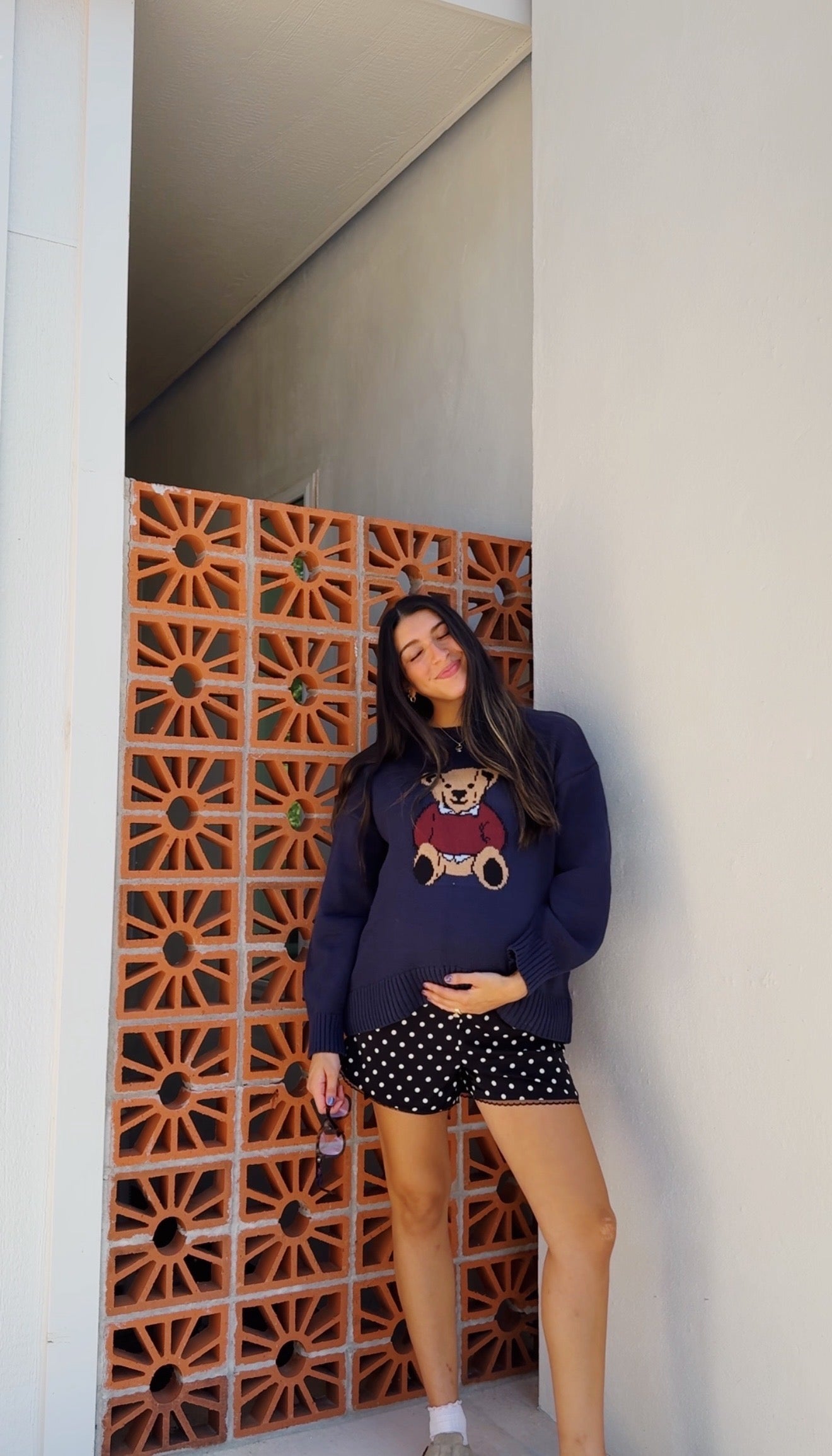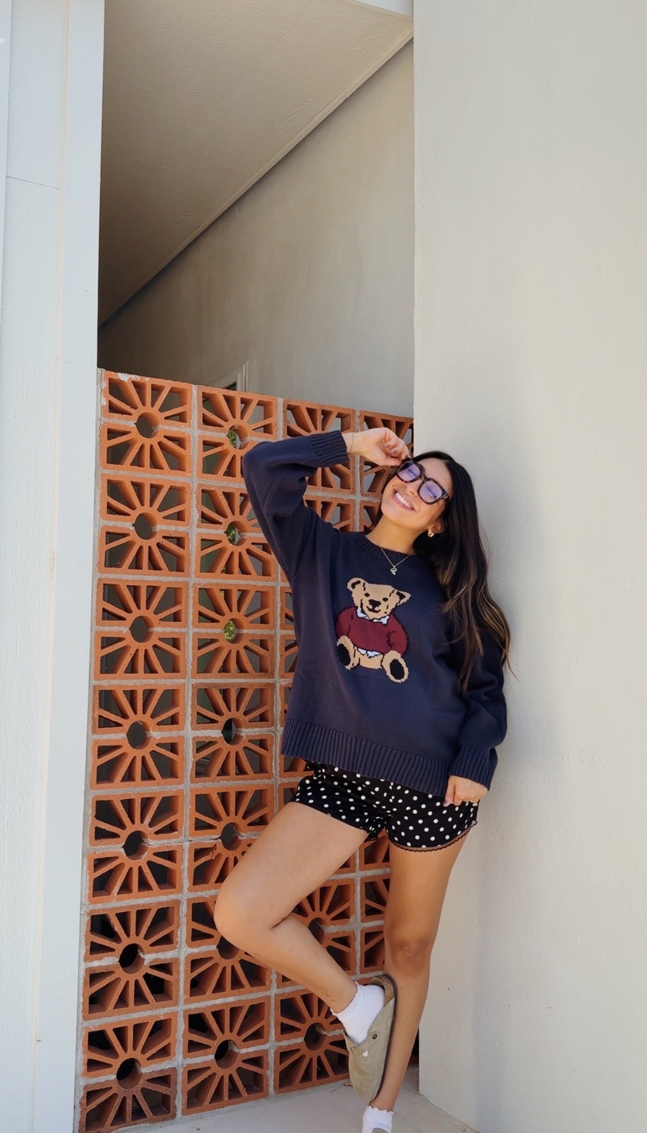 - navy crew sweater w/ teddy bear detail