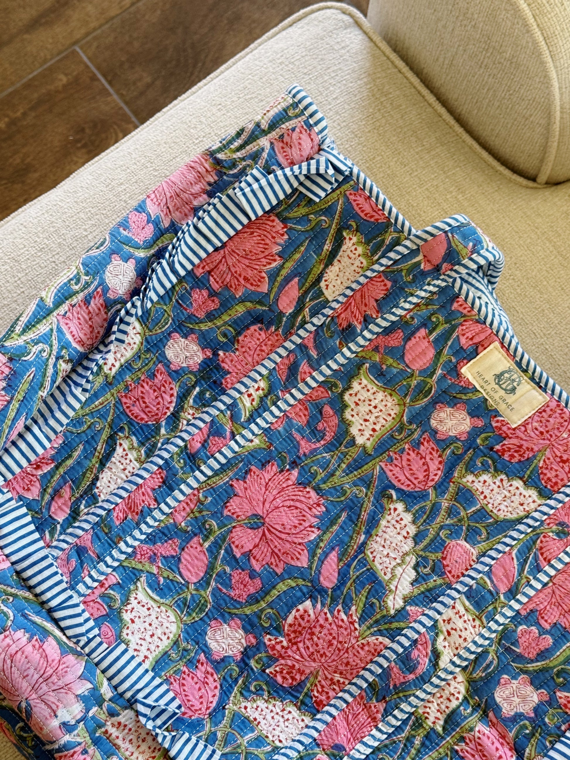 - Each piece is hand crafted and block printed by artisans, making it truly one of a kind and filled with timeless charm. The block printing process may have variations in color, printing, and fabric as part of the handmade process which is what makes each product unique.